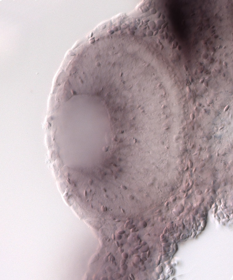 mcf2l.2 (MCF.2 cell line derived transforming sequence like L homeolog) gene expression in sectioned eye of X. laevis embryo, assayed via in situ hybridization, NF stage 39-40, lens epithelium and anterior left, dorsal up. Copyright © Perron Lab