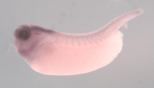 ahdc1 (AT-hook DNA binding motif containing 1) gene expression in X. laevis embryo, assayed via in situ hybridization, NF stage 35 & 36, lateral view, anterior left, dorsal up.