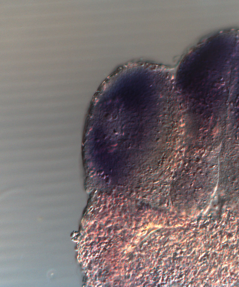 ccdc134 (coiled-coil domain containing 134) gene expression in sectioned eye of X. laevis embryo, assayed via in situ hybridization, NF stage 39-40, lens epithelium and anterior left, dorsal up. Copyright © Perron Lab