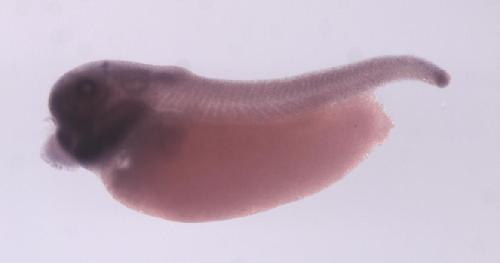 hint1 (histidine triad nucleotide binding protein 1 L homeolog) gene expression in X. laevis embryo, assayed via in situ hybridization, NF stage 35 & 36, lateral view, anterior left, dorsal up. Copyright © Perron Lab