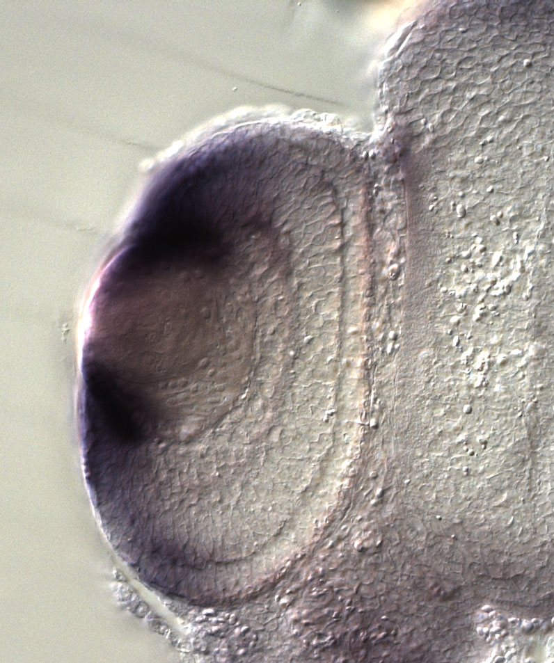 eef2 (eukaryotic translation elongation factor 2, gene 1) gene expression in sectioned eye of X. laevis embryo, assayed via in situ hybridization, NF stage 39-40, lens epithelium and anterior left, dorsal up.