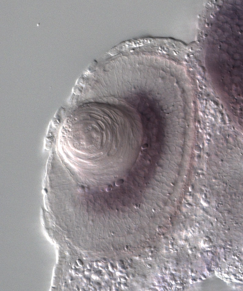 pgbd5 (piggyBac transposable element derived 5) gene expression in sectioned eye of X. laevis embryo, assayed via in situ hybridization, NF stage 39-40, lens epithelium and anterior left, dorsal up.