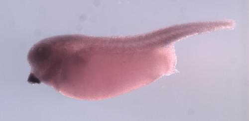 lyst (lysosomal trafficking regulator L homeolog) gene expression in X. laevis embryo, assayed via in situ hybridization, NF stage 37 & 38, lateral view, anterior left, dorsal up. Copyright © Perron Lab