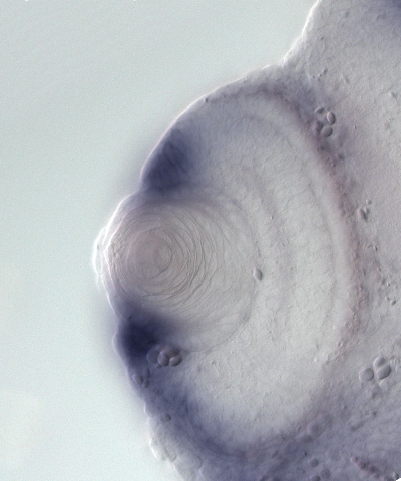 loc100127707 (major histocompatibility complex class I antigen precursor) gene expression in sectioned eye of X. laevis embryo, assayed via in situ hybridization, NF stage 39-40, lens epithelium and anterior left, dorsal up.