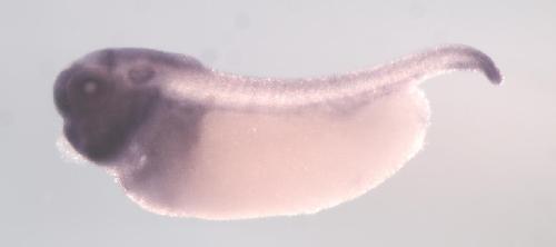 dhx38 (DEAH-box helicase 38) gene expression in X. laevis embryo, assayed via in situ hybridization, NF stage 33 & 34, lateral view, anterior left, dorsal up. Copyright © Perron Lab
