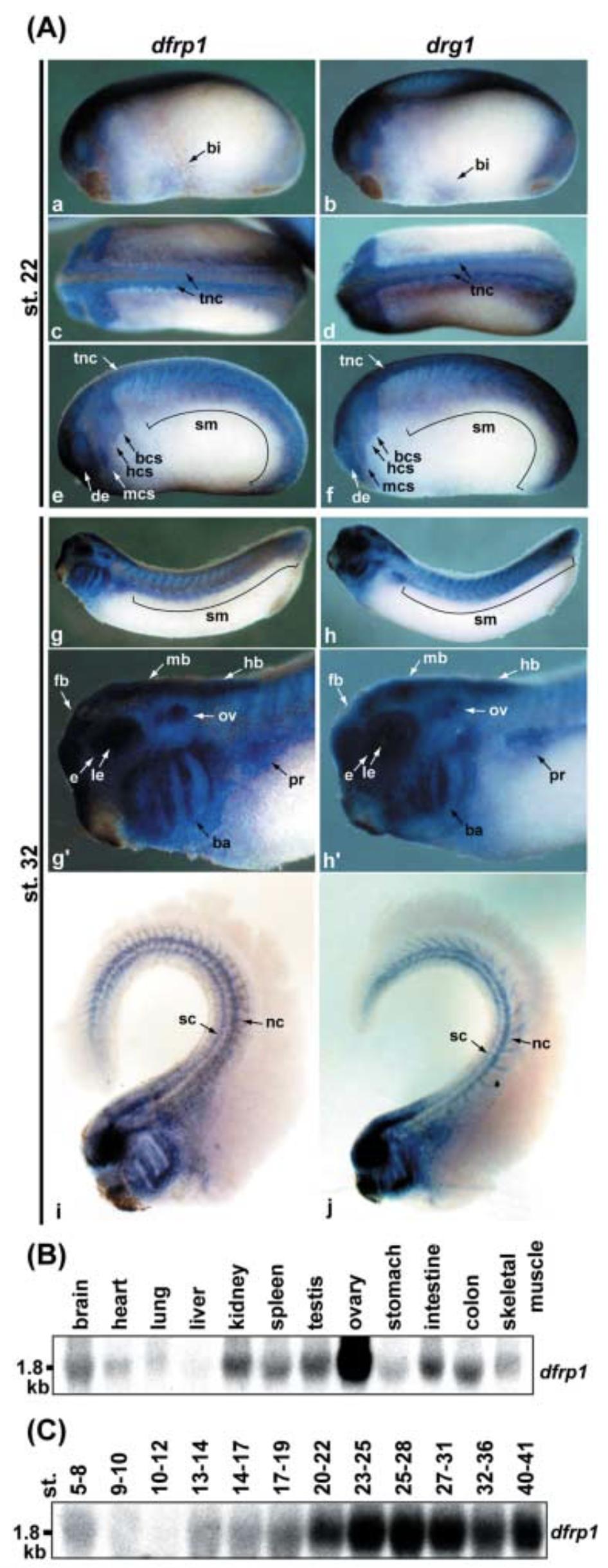 Figure 6 Expression analysis of dfrp1 and drg1 in X. laevis. (A) Spatial expression of dfrp1 and drg1 transcripts during Xenopus embryonic development. (a,b) Ventral views, anterior left; (c,d) Dorsal views, anterior left; (e–j) Lateral views, anterior left; (g′ and h′) Higher magnification images of the anterior part of the embryo depicted in g and h, respectively; (i, j) Clearing of embryo by benzyl alcohol:benzyl benzoate (2 : 1). Abbreviations: ba, branchial arch; bcs, branchial crest segment; bi, blood islands; de, developing eyes; e, eyes; fb, forebrain; hb, hindbrain; hcs, hyoid crest segment; le, lens; mb, midbrain; mcs, mandibular crest segment; nc, notochord; ov, otic vesicle; pr, pronephros; sc, spinal cord; sm, somite; tnc, trunk neural crest. (B) Tissue-specific expression of dfrp1 mRNAs in adult Xenopus.Total RNAs were isolated from the indicated adult tissues for Northern blotting. (C) Temporal expression of dfrp1 transcripts during X. laevis embryonic development.Total RNAs were isolated from Xenopus embryos at the indicated stages for Northern blotting. In (B,C), the same membrane that was used in our previous paper (Ishikawa et al. 2003) was reprobed.Therefore, quality and amount of RNA loaded were confirmed.