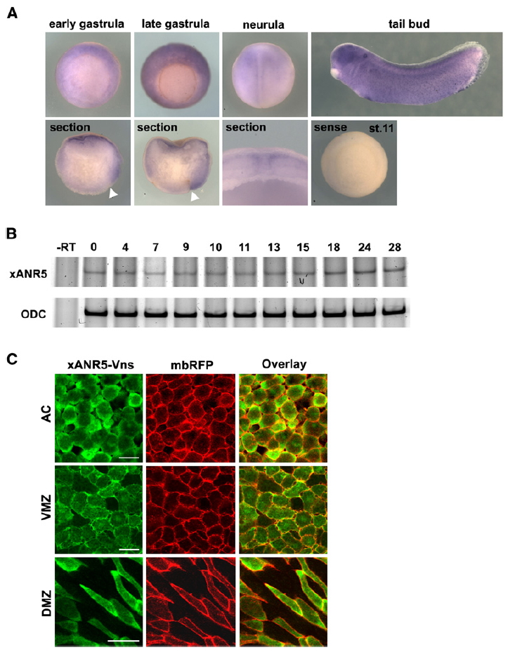 Figure S1. Expression Pattern and Subcellular Localizations of xANR5 through Early Embryogenesis (A and B) Whole-mount in situ hybridization analysis (WISH) and semiquantitative RT-PCR analyses showed ANR5 to be the product of a maternally expressed gene. The expression patterns of xANR5 in the gastrula were almost ubiquitous but dorsally enriched, as seen in the sagittal section. xANR5 RNA was expressed along the neural fold in the neurula, and observed in the eyes, midbrain, and hindbrain, and as dots in the epidermis in later stages. (C) Subcellular localization of xANR5 during early embryogenesis was detected by means of a Vns-tagged construct. A membrane-bound form of RFP was coinjected to detect plasma membrane. xANR5-Vns was localized near the plasma membrane in the AC and VMZ. In the DMZ, xANR5-Vns was localized to the two tips of the spindle-shaped dorsal cells. Scale bars represent 50 mm. Image published in: Chung HA et al. (2007) Copyright © 2007. Image reproduced with permission of the Publisher, Elsevier B. V.