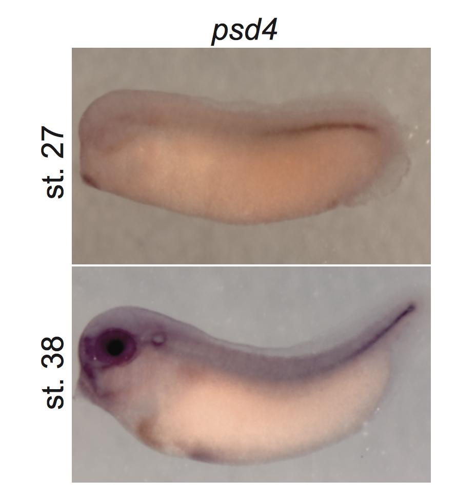 Supplementary Figure 1: psd4 expression by WMISH at stages before pronephros are functional (st. 27) and when they are starting to function (st. 38). Image published in: del Viso F et al. (2012) Copyright ©2012 del Viso et al. Creative Commons Attribution license