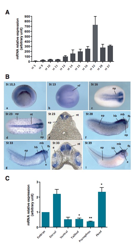 Fig. 4 (left). Spatio-temporal expression of pou3f1 during Xenopus laevis development. (A) Expression of pou3f1 analyzed by real-time quantitative polymerase chain reaction (RT-qPCR) at indicated stages of development. Average values from three independent experiments. (B) Whole mount in situ hybridization for pou3f1 at indicated stages of development. Early gastrula, vegetal view (a). Neurula, dorsal view (b,c). Tailbud, dorsal (d) and lateral (f) view. Tadpole, lateral view (g,i). Transverse sections at the level of the developing brain at tailbud stage (e) and at the level of the developing eye at tadpole stage (h). Abbreviations: e, eye; ep, epidermis; fb, forebrain; hb, hindbrain; mb, midbrain; nf, neural fold; np, neural plate; nt, neural tube; op, optic placode. (C) Expression of pou3f1 analyzed by RT-qPCR on dissected explants from tailbud-stage embryos, stage 25. Embryos were dissected either into ventral and dorsal halves or into tailbud, pronephros and head. Average values from three independent experiments. *: P < 0,05; **: P < 0,005, relative to the whole embryo.