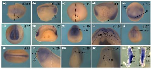 Figure 1. Expression patterns of p2ry4 during early development. WISH of p2ry4 from gastrula to tailbud stage. Stages 10.5 and 11 (a and c, dorsal views; b and d, sagittal hemisections). p2ry4 was expressed in the prospective neuroectoderm and the involuting dorsal and ventral mesoderm at gastrula stage. At stage 10.5, p2ry4 was prominently expressed in the head organizer region (b). Stages 13, 17, 19, and 21 (e, f, h, j, anterior views; k, dorsal view; g, sagittal hemisection; i, transverse section). Stage 28 (l, lateral view; m, transverse section; mâ, highâmagnification image of m). The extirpated brain of tadpole (n, lateral side; o, dorsal side). nc, neural crest; pl, placode cell; anp, anterior neural plate; mhb, midbrainâhindbrain boundary; nt, neural tube; not, notochord; som, somite; cg, cement gland; tel, telencephalon; di, diencephalon; mes, mesencephalon; met, metencephalon. Dotted straight line indicates section plane. Black arrowheads indicate blastopore Image published in: Harata A et al. (2019) © 2018 The Authors. Creative Commons Attribution license