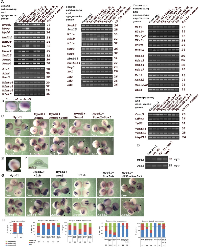 Fig. 7. Sox5 increases late myogenic regulators in Myod1-induced myogenic transcription assay. (A) Expression of more than 50 genes determined by semi-quantitative RT-PCR from RNA extracted of animal cap explants. Embryos were bilaterally injected with MyodF synthetic mRNA (100 pg) alone or co-injected with Sox5, Sox5-R, Sox5-A, Sox6, Sox6-R or Sox6-A (400 pg each). Number of PCR cycles was indicated on the left. (B) Embryos were injected unilaterally with 5 ng of moSox5 and then were submitted to in situ hybridization with Myog antisense probe at the stage 19/20. Myog labelling were compared to β-galactosidase control injected embryos. Dorsal view and anterior side on the right. β-galactosidase mRNA (blue) was co-injected to identify the injected side, indicated by an asterisk (*). Control, β-galactosidase mRNA alone. Probe is shown in the bottom right corner of each panel. (C) Embryos were injected unilaterally either with Myod1 synthetic mRNA (100 pg) alone or co-injected with Foxc1, Foxc1 plus Sox5, Foxc2, Foxc2 plus Sox5 (400 pg each), fixed at neurula stage and probed with Des and Actc1. (D) Expression of Nfib determined by semi-quantitative RT-PCR from RNA extracted of animal cap explants. Embryos were bilaterally injected with Myod1 synthetic mRNA (100 pg), Sox5, (400 pg) or both. Number of PCR cycles was indicated on the left. (E) In situ hybridization experiments showing Nfib expression in lateral view at stage 20, anterior side on the right. (F) transversal section showing Nfib expression in somites. (G) Embryos were injected unilaterally either with Nfib (400 pg), Myod1 synthetic mRNA (100 pg) alone or co-injected with Nfib, Sox5-A, Nfib plus Sox5-A, (400 pg each), fixed at neurula stage and probed with Des and Actc1. (H) Bar graph showing percentage of embryos with no, faint or strong expression (Des and Actc1) and with decreased,unchanged or increased expression (Myog). Chi-squared test analysis for Des expression: Myod1 versus Myod1+Foxc1 (P value = 0,0001), Myod1+Foxc1+Sox5 (P value = 0,0005), Myod1+Foxc2 (P value< 0,0001), Myod1+Foxc2+Sox5 (P value< 0,0001), Myod1+Foxc1 versus Myod1+Foxc1+Sox5 (P value = 0,0006), Myod1+Foxc2 versus Myod1+Foxc2+Sox5 (P value = 0,0021), Myod1 versus Myod1+Nfib (P value = 0,0001), Myod1+Sox5 (P value = 0,0001), Myod1+Sox5-A (P value< 0,0001), Myod1+Sox5-A versus Myod1+Sox5-A+Nfib (P value< 0,028), for Actc1 expression: Myod1 versus Myod1+Foxc1 ns, Myod1+Foxc1+Sox5 (P value = 0,0001), Myod1+Foxc2 ns, Myod1+Foxc2+Sox5 (P value< 0,0009), Myod1+Foxc1 versus Myod1+Foxc1+Sox5 (P value = 0,0424), Myod1+Foxc2 versus Myod1+Foxc2+Sox5 (P value = 0,049), Myod1 versus Myod1+Nfib (P value = 0,0007), Myod1+Sox5 (P value = 0,0001), Myod1+Sox5-A (P value< 0,0055), Myod1+Sox5-A versus Myod1+Sox5-A+Nfib (P value< 0,036). Chi-squared test analysis for Myog expression: Control versus moSox5 (P value< 0,0001). Numbers of injected embryos are indicated at the bottom of each bar. Image published in: Della Gaspera B et al. (2018) Copyright © 2018. Image reproduced with permission of the Publisher, Elsevier B. V.