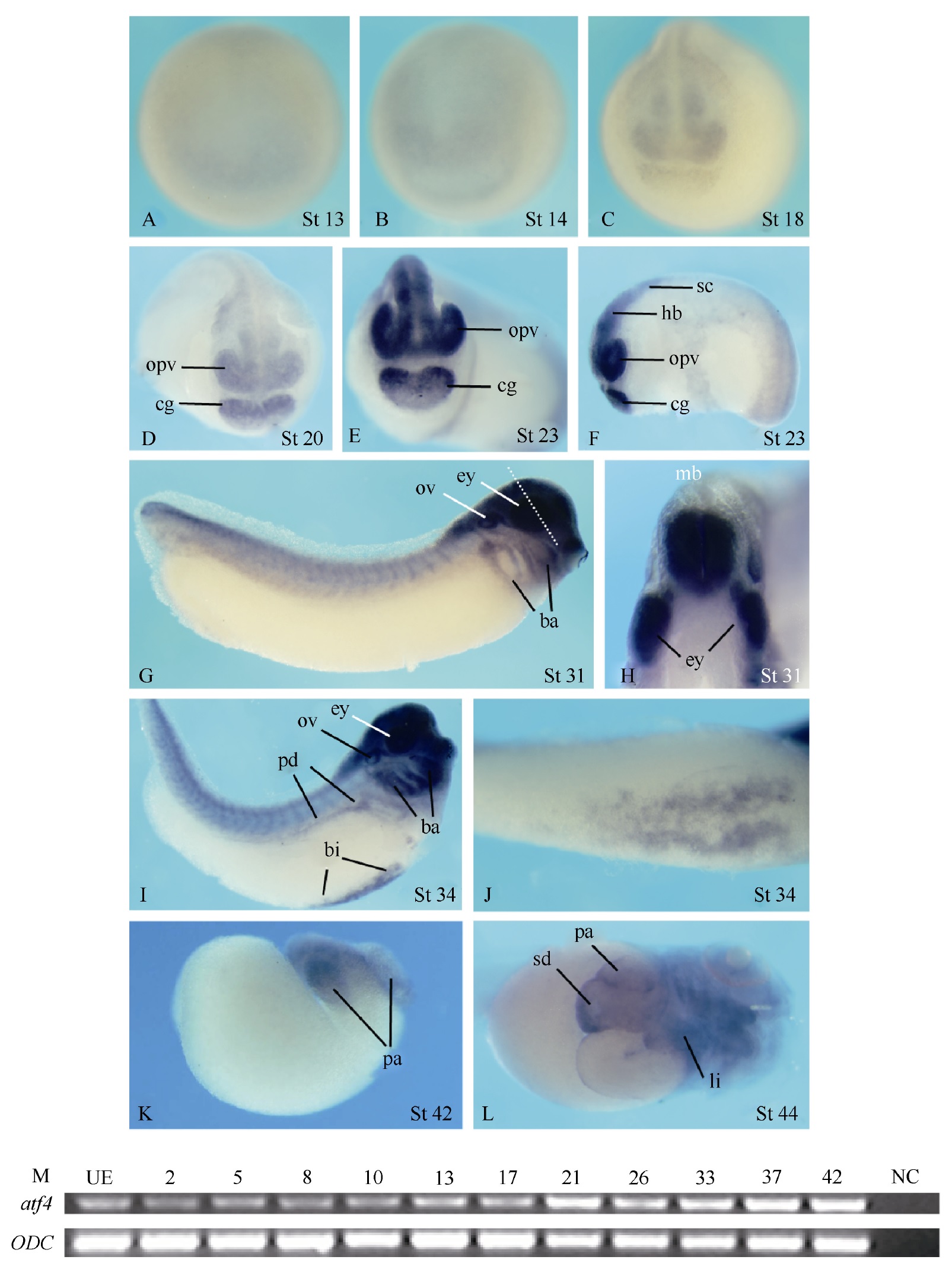 Fig. 1 Spatial and temporal expression of atf4 in Xenopus embryos (A-L) Whole mount in situ hybridization analysis data. (A-E) Anterior views. (F, G) Lateral views. (H) Anterior view of an embryo transversally dissected at the position indicated by the white dashed line in G. (I) Lateral view. (J) Ventral view of the embryo in I showing of the expression in the blood island. (K) Isolated gut. (L) Ventral view. ba, branchial arches; bi, blood island; cg, cement gland; ey, eye; hb, hindbrain; li, liver; mb, midbrain; opv, optic vesicle; ov, otic vesicle; pa, pancreas; pd, pronephric duct; sc, spinal cord; sd, part of stomach and duodenum. (M) RT-PCR analysis reveals the temporal expression profile of atf4 during Xenopus embryogenesis. UE, unfertilized egg. NC, negative control. Ornithine decarboxylase (ODC) was used as the loading control.