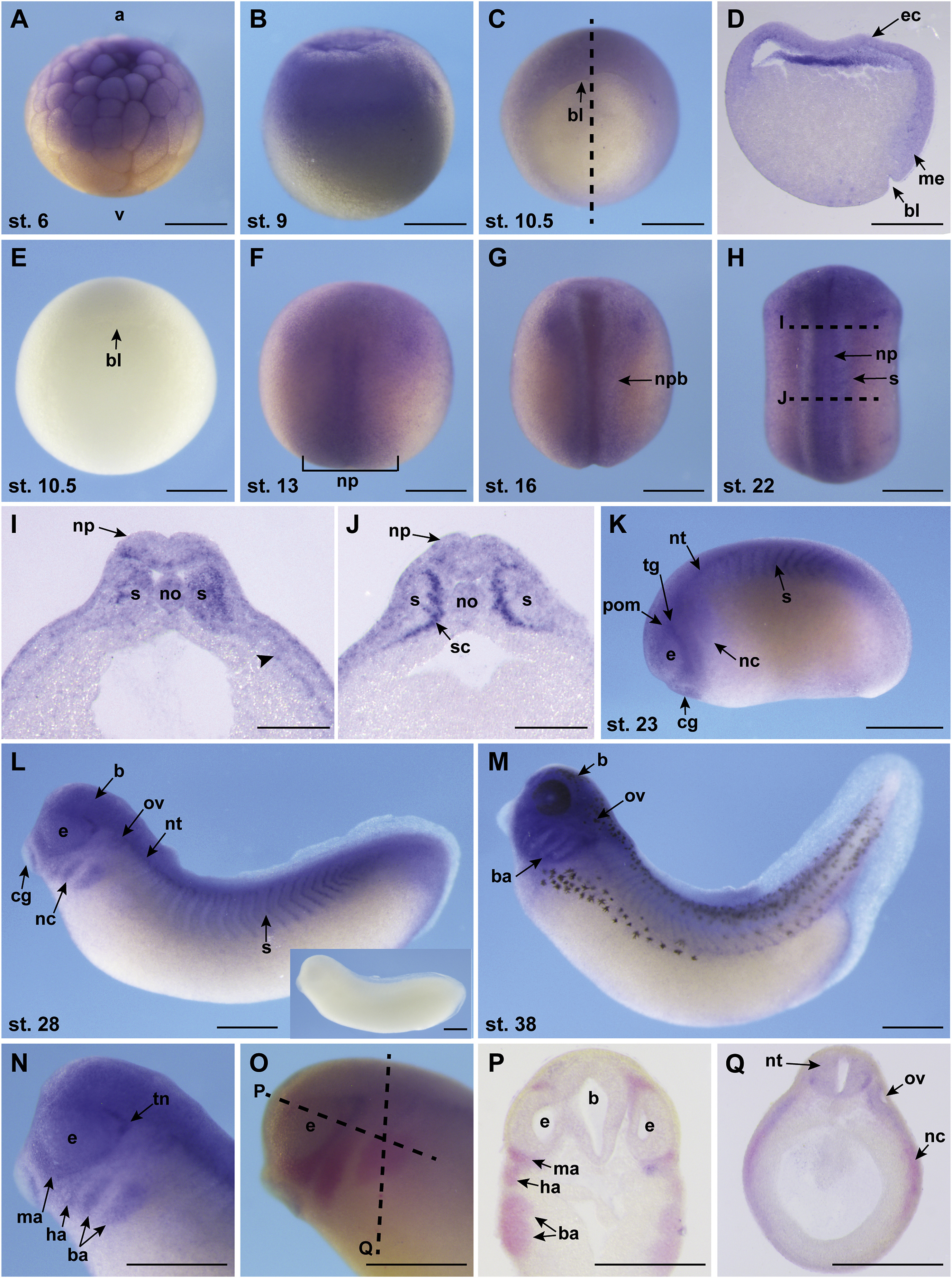 Fig. 4. Spatial gene expression pattern of trio. Trio gene expression was analyzed by whole mount in situ hybridization. Embryonic stages are indicated. The detailed expression pattern is described in the text. A Embryo at cleavage stage, lateral view. B Blastula stage embryo, lateral view. C Gastrula stage embryo, blastopore lip is indicated. D Transverse section of embryo in C; section plane is indicated in C. E Control in situ hybridization using a sense trio probe; gastrula stage embryo. F,G Neurula stage embryos, dorsal view. H Tailbud stage embryo, dorsal view. I,J Transverse sections of embryo shown in H. Section planes are indicated in H. Arrowhead in I marks staining between the meso- and endoderm likely representing migrating NC cells. K-M Tailbud stage embryos, lateral view. Sense control at stage 28 is indicated in the insert in L. N Higher magnification of the head of the embryo shown in L. O Double in situ hybridization showing trio (blue) and twist (red) co-expression in cranial NC cells. P, Q Transverse sections of tadpole embryos analyzed by trio/twist double in situ hybridization. Section planes are indicated in O. Abbreviations: a: animal, b: brain; ba: branchial arches; bl: blastopore lip; cg: cement gland; e: eye; ec: ectoderm; ha: hyoidal arch; ma: mandibular arch; me: mesoderm; nc: neural crest; no: notochord; np: neural plate; npb: neural plate border; nt: neural tube; ov: otic vesicle; s: somites; pom: periocular mesenchyme; sc: sclerotome; tg: trigeminal ganglion; v: vegetal. Scale bar: 500â¯Î¼m (I,J: 200â¯Î¼m). Image published in: Kratzer MC et al. (2019) Copyright © 2019. Image reproduced with permission of the Publisher, Elsevier B. V.