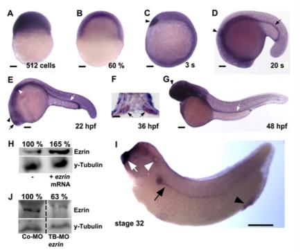 immunoblot served as loading control. (I) ezrin is expressed in the cement gland (white arrow), otic vesicle (white arrowhead), pronephros (black arrow), cloaca (black arrowhead) and throughout the epidermis at stage 32 of Xenopus development. (J) Immunoblot of Xenopus lysates (stage 32) after injection of TB-Mo ezrin (8 ng) into the animal-ventral blastomeres of four-cell stage Xenopus embryos indicates a reduction of Ezrin expression compared to Co-MO (8 ng) injected embryos. Anti-γ-Tubulin immunoblot served as loading control. Scale bars, 100 μm (A,B,C,D,E,G), 20 μm (F), 500 μm (I).
