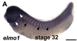 elmo1 (engulfment and cell motility 1) gene expression in Xenopus laevis embryo, assayed via in situ hybridization, NF stage 32, lateral view, anterior left, dorsal up. This image is extracted from figure published in: Epting D et al. (2015), Image published in: Epting D et al. (2015) Copyright © 2015. Image reproduced with permission of the Publisher.