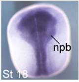cdk9 (cyclin-dependent kinase 9) gene expression in Xenopus laevis embryo, assayed via in situ hybridization, NF stage 18, dorsal view, anterior up.