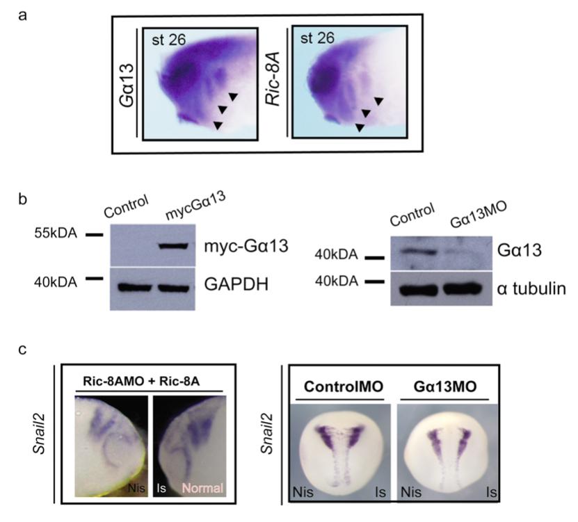 Figure S1: (a) In situ hybridization confirms the presence of Gα13 and Ric8A transcripts in migrating cranial NC cells at stage 26, as previously reported in Maldonado-Agurto et al. (2011) and Fuentealba et al. (2016). (b) Gα13 gain and loss of function controls. Left panel: Anti-Myc Western blot in embryos injected with a myc-Gα13 mRNA. Right panel: Anti-Gα13 Western blot showing that morphant embryos display diminished levels of endogenous Gα13 protein. GAPDH and α-tubulin were used as loading controls. (c) The rescue assay of the Ric-8A morpholino was performed using a myc-Ric-8A mRNA, as previously reported in Fuentealba et al.(2013). Snail2 was used as a migratory cranial NC marker at stage 23 (left panel). Snail2 expression is unaffected in stage 16 Gα13 morphant embryos (right panel). Legend: Is, injected side; Nis: non-injected side. All experiments shown here were performed in X. tropicalis. Image published in: Toro-Tapia G et al. (2018) Copyright © 2018. Image reproduced with permission of the Publisher and the copyright holder. This is an Open Access article distributed under the terms of the Creative Commons Attribution License.