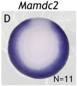 mamdc2 (MAM domain containing 2) gene expression in Xenopus laevis embryo, assayed via in situ hybridization, NF stage 10.5, vegetal view, dorsal up. This image is extracted from figure published in: Janesick A et al. (2018), Image published in: Janesick A et al. (2018) Copyright © 2018. Image reproduced with permission of the Publisher and the copyright holder. This is an Open Access article distributed under the terms of the Creative Commons Attribution License.