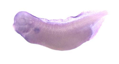 slc25a1 (solute carrier family 25 member 1) gene expression in Xenopus laevis embryo, assayed via in situ hybridization, NF stage 35 & 36, lateral view, anterior left, dorsal up. Clone sequence: BC041303