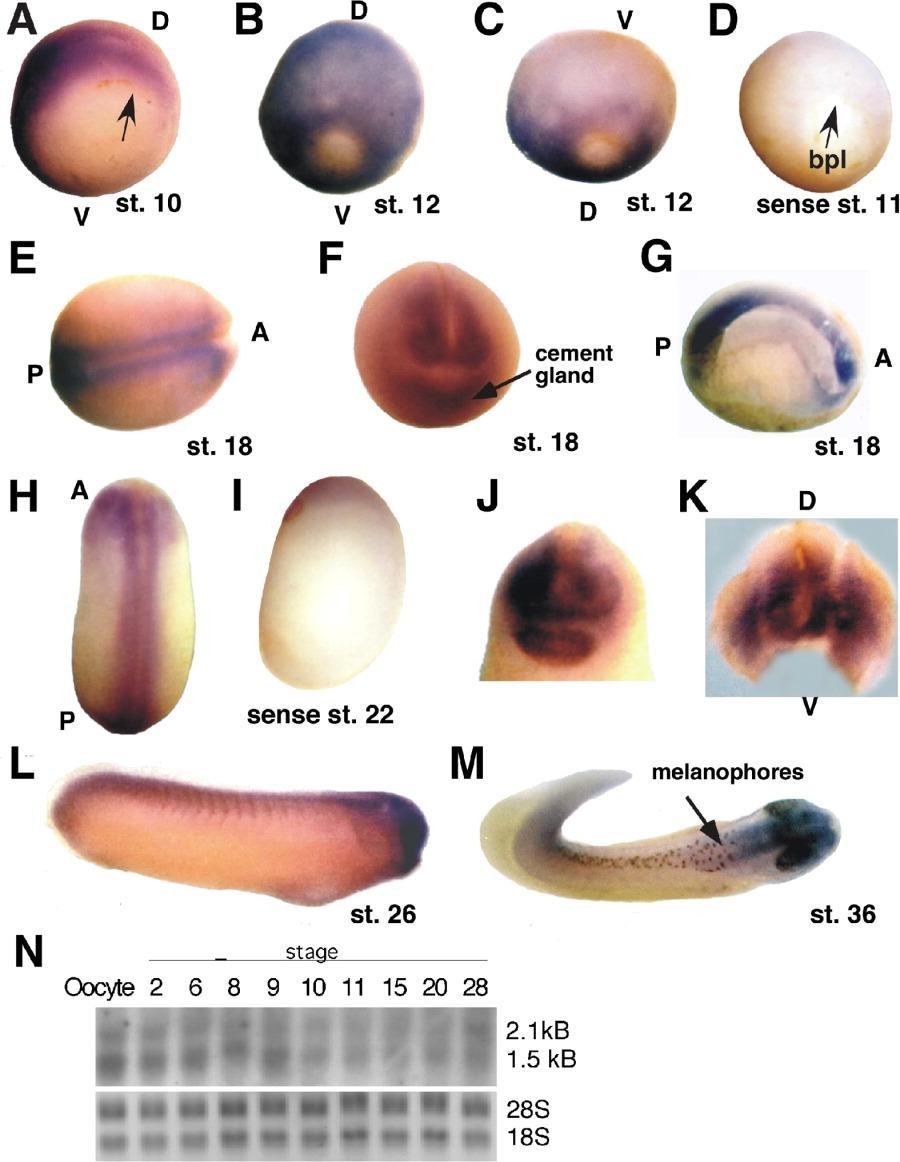 Figure 2. Spatial and temporal analysis of ashwin expression. Dorsal is toward the top, unless otherwise indicated. A: Stage (st.) 10; ashwin is expressed throughout the dorsal circumblastoporal zone. An arrow indicates the dorsal lip. B: A st. 12, dorsal view; expression is detected throughout the dorsal ectoderm and marginal zone. C: St. 12, ventral view; expression is excluded from the ventral hemisphere except for the circumblastoporal ring. D: Embryo hybridized with a sense probe. E: A st. 18, dorsal view; expression is visible in the neural ectoderm. F: A st. 18, frontal view reveals expression in anterior neural folds. G: A st. 18, midline sagittal dissection; expression is strongest in anterior and posterior neural domains but also is detected in the notochord and prechordal plate. H-K: At st. 22. H: Expression is detected throughout the developing nervous system and optic vesicles. I: Sense probe hybridization. J: Frontal view. K: Forebrain dissection; expression is detected in the ventral aspect of the brain and throughout the eye anlagen. L: At st. 26; ashwin is expressed throughout the central nervous system and in the tail bud. M: At st. 36; ashwin is expressed strongly in the brain and moderately in the posterior axial region. D, dorsal; V, ventral; A, anterior; P, posterior. N: Northern analysis of ashwin expression in Xenopus embryos at various embryonic stages. Each lane shows RNA isolated from two embryos at each of the stages indicated. The ashwin transcripts were visualized using a radiolabeled PCR probe. Two transcripts at 1.5 and 2.1 kb are expressed both maternally and zygotically. Levels of 18S and 28S rRNA are included to indicate the total amount of RNA loaded in each lane. Image published in: Patil SS et al. (2006) Copyright © 2006. Image reproduced with permission of the Publisher, John Wiley & Sons.