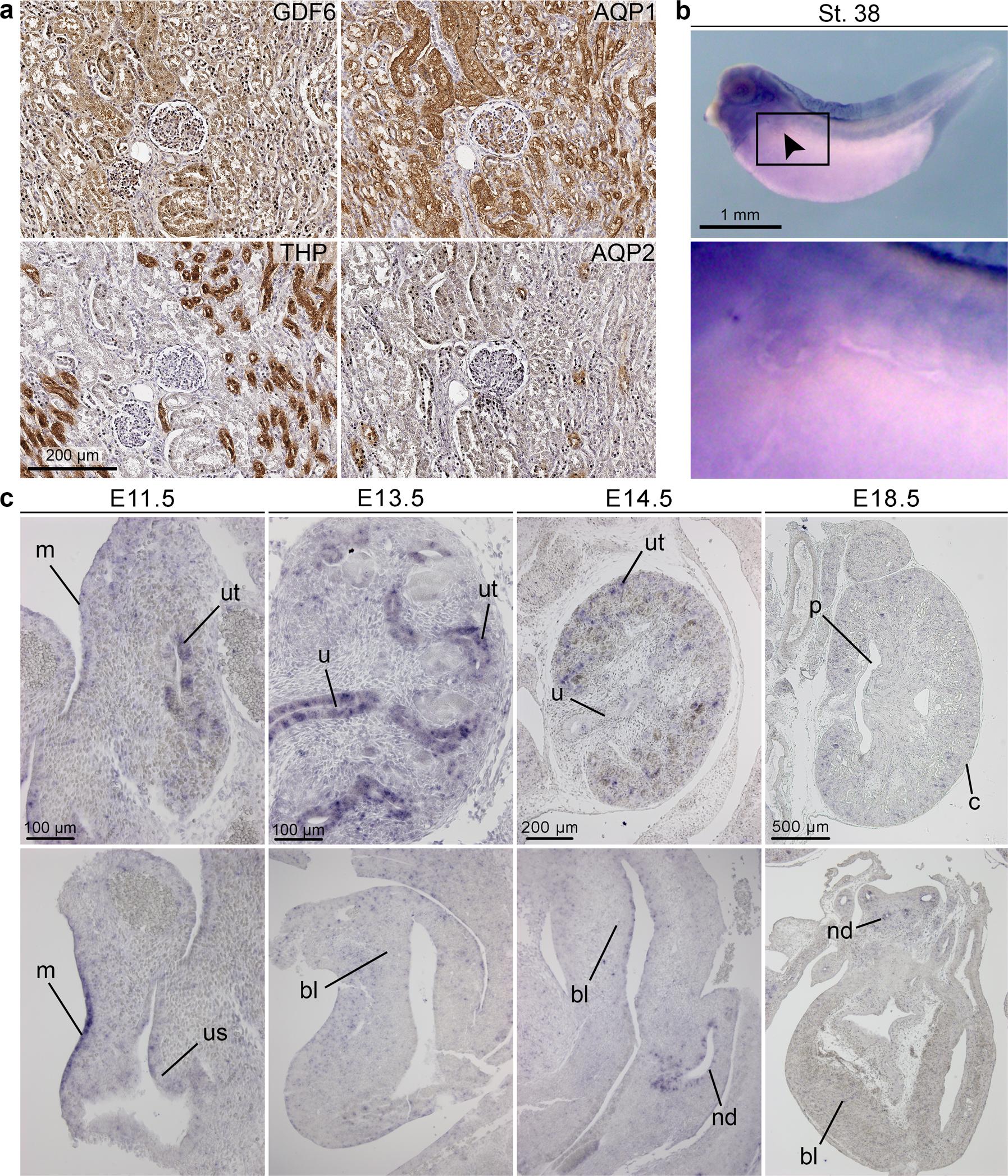 a By immunohistochemical detection of GDF6 and the marker proteins aquaporin-1 (AQP1, straight and convoluted proximal tubule and thin descending limb of loop of Henle), aquaporin-2 (AQP2, collecting duct), and Tamm-Horsfall protein (THP, thick ascending limb of loop of Henle and distal tubule) in a normal human infant kidney section, GDF6 localized most prominently to proximal tubules. b By whole-mount RNA in situ hybridization in Xenopus laevis at stage 38, gdf6 was expressed in the tissue surrounding the pronephric tubule (arrow, enlarged image) as well as in the developing eye, branchial arches, notochord, and neural tube. c RNA in situ hybridization analysis on sagittal sections of the murine kidney and bladder from E11.5 to E18.5. Gdf6 expression was present in all compartments of the developing ureteric tree, including the ureteric tips (ut) and the ureter (u), at E11.5 to E14.5, dropped after onset of collecting duct differentiation, and was barely detectable at E18.5 (p pelvis, c cortex). In the lower urogenital tract, Gdf6 expression was found in the mesothelial lining (m) of the abdominal cavity at E11.5, in the undifferentiated urothelium of the urogenital sinus (us) and the bladder (bl) until E14.5, and in the nephric duct (nd) of male embryos at all analyzed stages (data partly not shown). Sections from three independent murine specimens were analyzed. Image published in: Martens H et al. (2020) © The Author(s) 2020. Creative Commons Attribution license