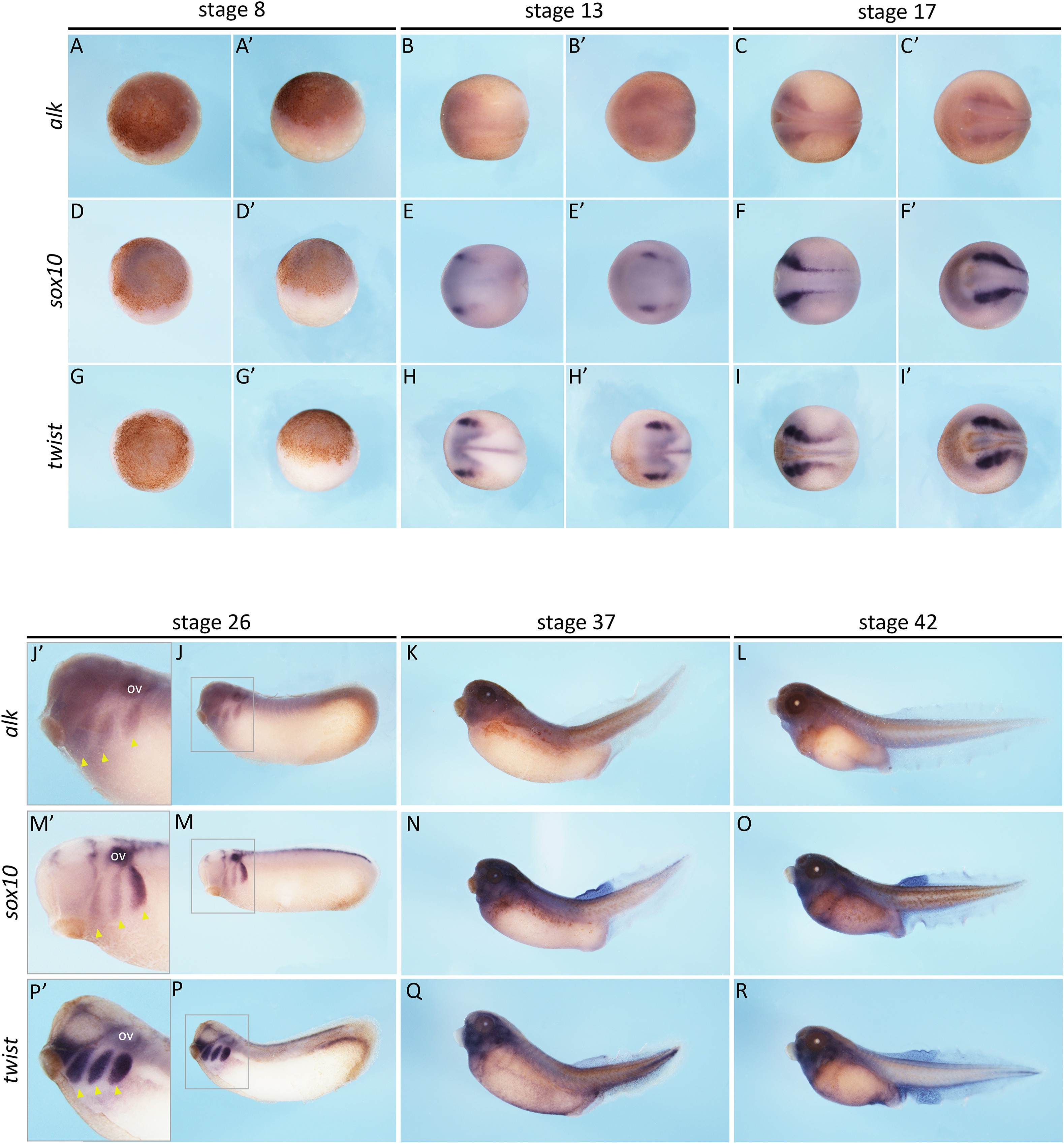 Fig. 2. alk expression pattern in Xenopus laevis. mRNA in situ hybridisation for alk and neural crest markers, sox10 and twist, in Xenopus laevis embryos at stages 8, 13, 17, 26, 37 and 42 (Nieuwkoop and Faber, 1994). Animal (A, D and G) and lateral (Aâ², Dâ² and Gâ²) view of stage 8 embryos (alk n = 11, sox10 n = 5, twist n = 4). Dorsal (B, E and H) and anterior (Bâ², Eâ² and Hâ²) view of stage 13 embryos (alk n = 12, sox10 n = 4, twist n = 2). Dorsal (C, F and I) and anterior (Câ², Fâ² and Iâ²) view of stage 17 embryos (alk n = 7, sox10 n = 4, twist n = 4). Lateral view (J, M and P) of stage 26 embryos and zoomed insets (grey rectagles) of embryos heads (Jâ², Mâ² and Pâ²), showing otic vesicles (OV) and neural crest streams (yellow arrowheads) (alk n = 8, sox10 n = 7, twist n = 5). Lateral view (K, N and Q) of stage 37 embryos (alk n = 10, sox10 n = 7, twist n = 5) and stage 42 embryos. Lateral view (L, O and R) of stage 42 embryos (alk n = 11, sox10 n = 5, twist n = 7).