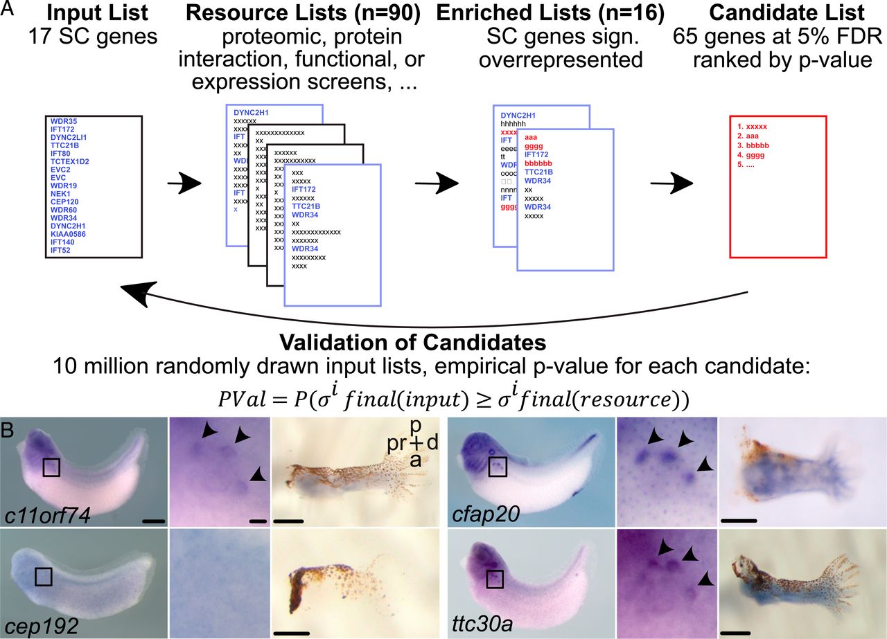Fig. 3. In silico screening for candidates with similar properties to SC genes. (A) Schematic of the in silico screen. Known SC disease genes served as an input list. Resource lists represent datasets from various published screening approaches and were tested for enrichment of genes contained in the input list genes. Genes in significantly enriched resource lists were then scored based on membership or rank. The gene scores were statistically validated by an empirical P value based on 10 million random drawings of input list. (B) Whole-mount in situ hybridizations for four candidate genes (c11orf74, cep192, cfap20, and ttc30a) that were experimentally followed up are shown for tadpoles at stage 31 to 35 (nephrostome expression enlarged) and limb buds (stage 55 to 57). (Scale bars, 0.5 mm.) p, posterior; a, anterior; pr, proximal; and d, distal. Image published in: Getwan M et al. (2021) Copyright © 2021 the Author(s). Creative Commons Attribution-NonCommercial-NoDerivatives license
