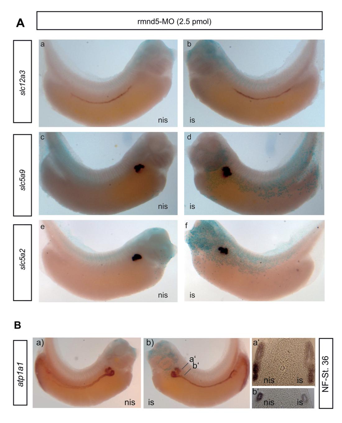 (c, d), and slc5a2 (e, f). (B) rmnd5a-morpholinos injected embryos were used for in situ hybridizations (WMISH) (NF36) with indicated marker atp1a1. aâ and bâ show zoom sections of embryos kidneys. Abbreviations: is, injected side; nis, non-injected side. Image published in: Hantel F et al. (2022) © 2022. Creative Commons Attribution license