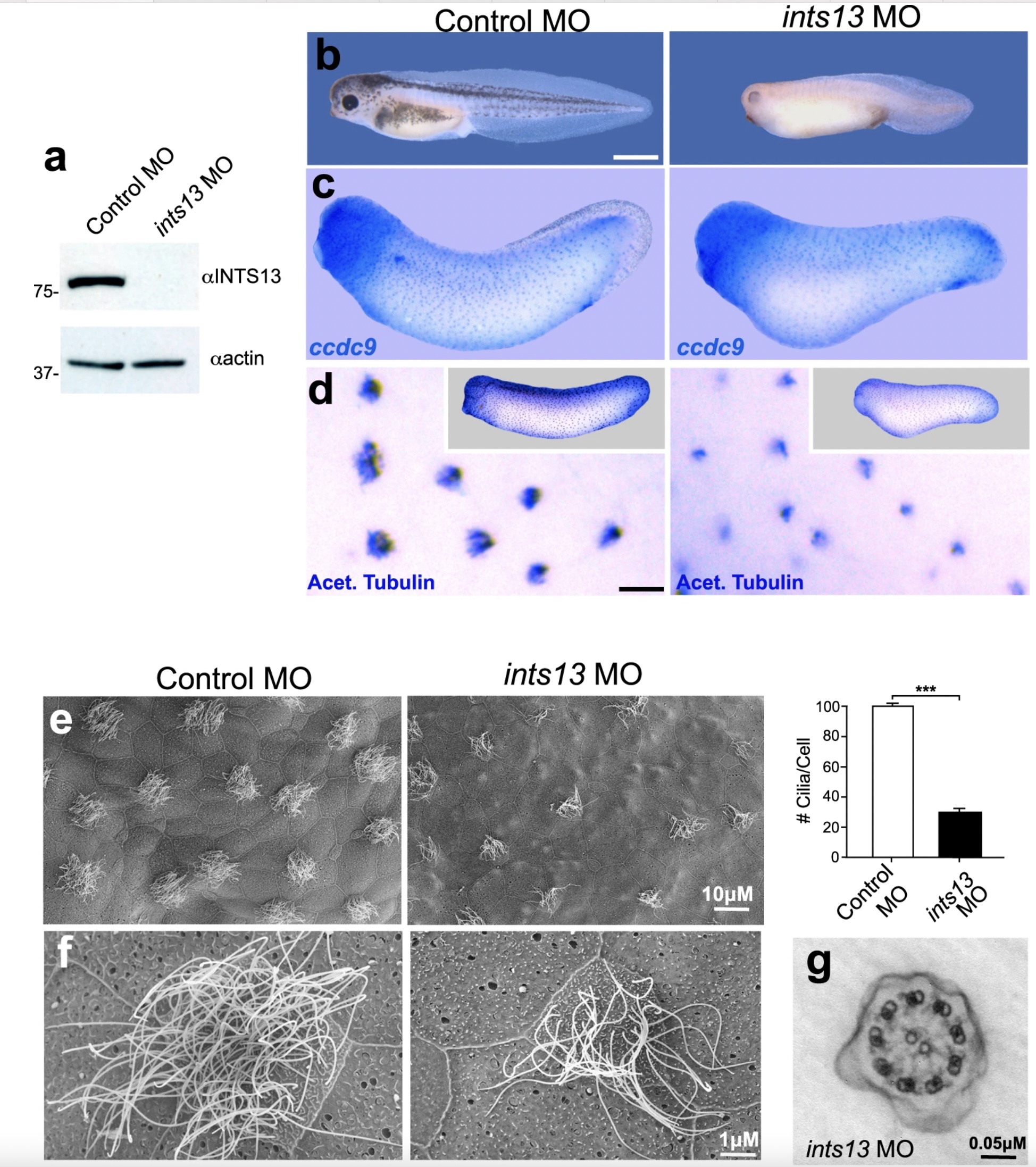 a Western blot showing that the INTS13 MO was able to deplete INTS13 protein in Xenopus embryos and molecular weight markers shown are in kilodaltons. b In comparison to control embryos, morpholino (MO)-mediated knock down of INTS13 in Xenopus leads to severe developmental defects including a small head, big belly, short and down curved body axes, cardiac edema and massive developmental delay. Scale bar represents 500 μM. c In situ hybridization using a specific probe for the multi-ciliated cell (MCC) marker ccdc9 shows a reduction in ccdc9 expression in MCC of morphants compared to control embryos. d Whole mount antibody staining for acetylated α-tubulin shows a punctate pattern similar to ccdc9. The puncta have a more condensed and stronger signal in control embryos. A higher magnification view of the MCC shows marked reduction in cilia compared to controls. b–d n > 60 control or morphants embryos were used for three sets of independent injections. Scale bar represents 50 μM. e Low magnification SEM imaging of Xenopus MCC at embryonic stage 28. MCCs of a control embryo possess multiple, long cilia, whereas the morphant MCCs display fewer cilia per cell which appear to be disorganized. f High magnification SEM imaging of Xenopus MCC at embryonic stage 28. Ciliary length seems unperturbed in morphant embryos, while the average number of cilia on individual MCCs is clearly reduced by INTS13 knockdown. The average MCC in morphants have less than half of the number of cilia per cell compared to control, as shown in the bar graph. g The ultrastructure of the cilia in morphants appears to show a normal 9 + 2 structure as imaged by TEM. e, f, n = 3 control or morphant tadpoles were processed for SEM and n > 30 multiciliated cells were examined for the number of cilia present. g n = 5 cilia were examined by TEM. *p < 0.05, **p < 0.01, ***p < 0.001, ****p < 0.0001, respectively. Source data are provided as a Source Data file.