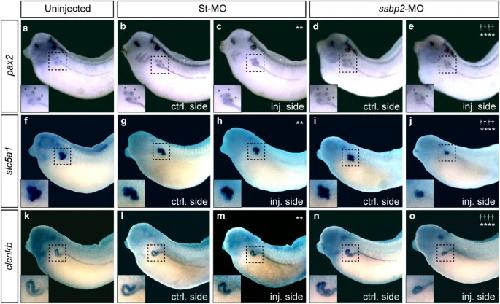 Figure 5. Ssbp2 depletion reduces the expression domain of proximal and distal tubule markers. 8-cell stage Xenopus embryos were injected into a single V2 blastomere as indicated. The uninjected contralateral side was used as an internal control. (ae) WISH for pax2 in stage 32 embryos. *Indicate the position of the nephrostomes. (a) Uninjected embryo (8% affected, n=37, N=3). (b, c) St-MO 15 ng injected embryo (23% affected, n=40, N=2). (d, e) ssbp2-MO 15 ng injected embryo (66% affected, n=51, N=3). (fj) WISH for slc5a1 in stage 39 embryos. (f) Uninjected embryo (4% affected, n=47, N=2). (g, h) St-MO 15 ng injected embryo (19% affected, n=39, N=2). (i, j) ssbp2-MO 15 ng injected embryo (50% affected, n=34, N=2). (ko) WISH for clcnkb in stage 39 embryos. (k) Uninjected embryo (3% affected, n=35, N=2). (l, m) St-MO 15 ng injected embryo (23% affected, n=41, N=2). (n, o) ssbp2-MO 15 ng injected embryo (49% affected, n=33, N=2). Magnifications of the pronephric tubules enclosed by the black squares are shown in the left-bottom corner. Statistical significance was evaluated using Chi-square test (****p<0.0001; **p<0.01). *, Represent the comparison to the uninjected and the St-MO injected groups, respectively. Representative embryos are shown. Image published in: Cervino AS et al. (2023) © The Author(s) 2023. Creative Commons Attribution license