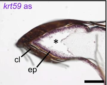 krt59 (keratin 59) gene expression in X. tropicalis juvenile frog, assayed via in situ hybridization, on sections of hindlimb inner clawed toes. Key: cl, claw; ep, epidermis. Scale bar: 100um Image published in: Carron M et al. (2024) © The Author(s) 2024. Creative Commons Attribution license