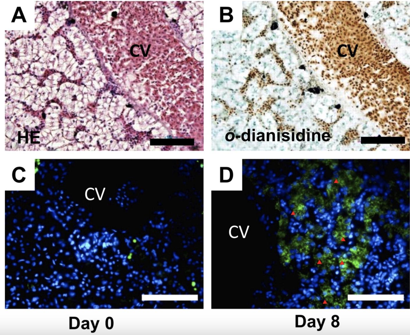 Fig. 1. Erythropoietin receptor (EPOR) expression in the adult liver of Xenopus laevis. Hematoxylin and eosin staining (A) and o-dianisidine staining (B) of paraffin-embedded sagittal tissue sections (4 m thickness) fixed in Bouin's solution. CV indicates the central vein. Immunohistochemical staining of normal (Day 0, C) and phenylhydrazine (PHZ)-anemic (Day 8, D) transverse liver sections (10 m thickness) with xlEPOR polyclonal antibody. xlEPOR-positive cells reside in the hepatic sinusoid of anemic liver. Arrowheads indicate xlEPOR-positive cells, which lie adjacent to the central vein. Nuclei are stained with DAPI (blue). Scale bars represent 100 m.