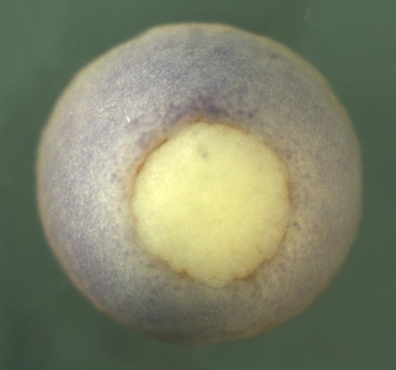 cibar1 (CBY1 interacting BAR domain containing 1) gebe expression in Xenopus laevis, NF stage 12 embryo, assayed via in situ hybridization, vegetal/blastoporal view, dorsal up. Copyright © XDB3