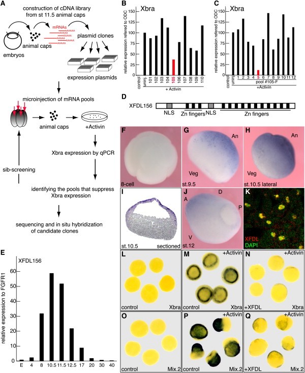 Figure 1. Functional Screening for Zygotic Nuclear Factors that Inhibit Activin-Induced Mesoderm Differentiation in the Animal Cap(A) Schematic of the functional screen.(B) q-PCR analysis for Xbra expression in Activin-treated animal caps injected with pooled mRNAs. In this experiment, pool #105 substantially suppressed Xbra expression.(C) Example of the isolation of a clone (#105-F5) that reduced Xbra expression. Each clone from the #105-F pool (12 clones) was analyzed as in (B).(D) The structure of XFDL. Nuclear localization signals (gray boxes); zinc-finger motifs (black boxes).(E) XFDL expression analyzed by q-PCR. Numbers represent the stages of embryos. E: unfertilized egg. (FâJ) Whole-mount in situ hybridization of XFDL expression in 8-cell (F), late blastula (stage 9.5; G), early gastrula (stage 10.5; H and I), and mid-gastrula (stage 12; J) embryos. (I) Sagittal section. An: animal, Veg: vegetal, A: anterior, P: posterior, D: dorsal, V: ventral. (K) Immunohistochemistry using an anti-XFDL156 antibody (red) in animal cap cells at stage 10.5. DAPI staining (green).(LâQ) Expression of Xbra (LâN) and Mix.2 (OâQ) in animal cap explants analyzed by in situ hybridization. Animal caps given injections of control (L, M, O, and P; 400 pg/cell) or XFDL (N and Q; 400 pg/cell) mRNAs were prepared at the mid-blastula stage (stage 8.5) and cultured until siblings reached stage 11 without (L and O) or with (M, N, P, and Q) 5 ng/ml Activin. Image published in: Sasai N et al. (2008) Copyright © 2008. Image reproduced with permission of the Publisher, Elsevier B. V.