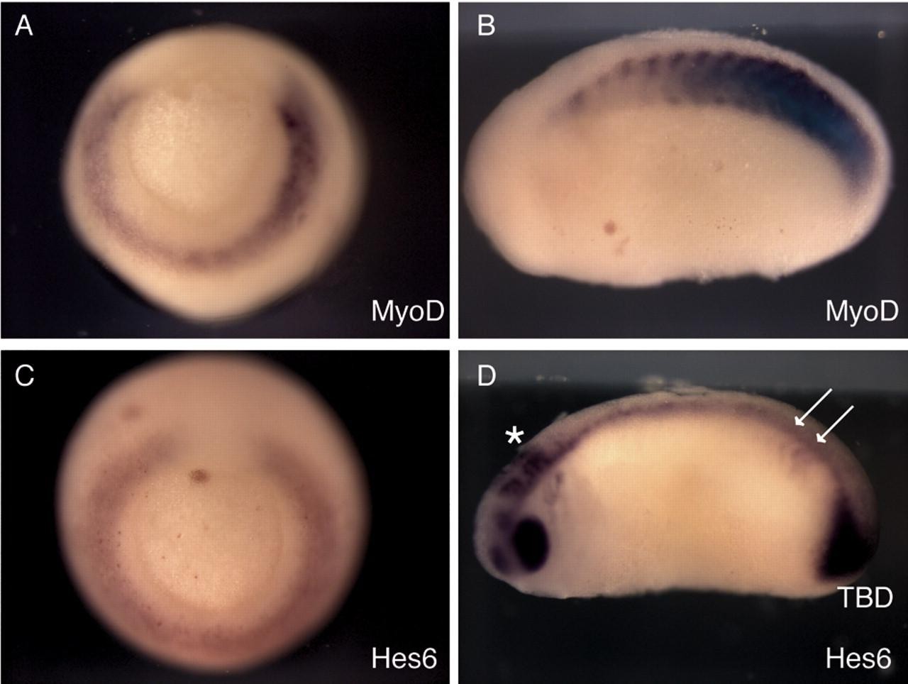 Fig. 5. XHes6 is expressed in the presomitic mesoderm and somitic chevrons. Embryos were analysed by whole-mount in situ hybridisation at early gastrula stage (stage 10.5) (A,C) and tailbud stage (stage 22) (B,D) for expression of MyoD (A,B) and Hes6 (C,D). Both MyoD and Hes6 are found in a ring of prospective mesoderm around the dorsal pore at stage 10.5 (A,C, respectively). At stage 22, MyoD is restricted to myotome but is expressed uniformly throughout (B). Hes6 is found in the eye, brain (asterisk), neural tube, tailbud domain (TBD) and in two to three chevrons anterior to the TBD (arrows, D). Image published in: Cossins J et al. (2002) Copyright © 2002. Image reproduced with permission of the Publisher and the copyright holder. This is an Open Access article distributed under the terms of the Creative Commons Attribution License.