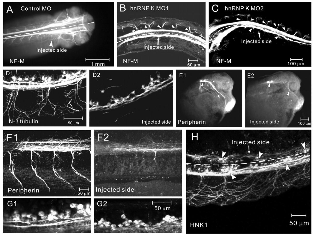 Fig. 4. Suppression of axonal outgrowth by hnRNP K MO in intact animals. Embryos unilaterally injected with control MO (A), hnRNP K MO1 (B,D-H) or hnRNP K MO2 (C) processed at stage 37/38 by whole-mount immunofluorescence. (A-C) Embryos injected with control MO (A), hnRNP K MO1 (B) or MO2 (C), and immunostained for NF-M. Broken lines separate injected (lower) from uninjected (upper) sides. (B,C) Arrowheads on the injected side indicate peripheral motor axons; arrowheads on the uninjected side indicate residual wispy peripheral axons. (A) View under the fluorescence dissecting microscope; (B,C) stacked confocal optical sections. (D1) Neuronal β-tubulin staining in neuronal perikarya and peripheral axons of spinal cord, uninjected side. (D2) Tubulin staining in perikarya and a few scattered fibers, injected side. (E1-G2) Peripherin immunostaining of head (E1,E2) and spinal cord (F1,F2,G1,G2). (E1,F1,G1) Uninjected side; (E2,F2,G2) injected side. (E1,E2) Trigeminal ganglion neuronal perikarya (upper arrowhead) and nerves (lower arrowhead). (F1,F2) Spinal cord with peripheral motor axons. (G1,G2) Spinal cord neuronal perikarya. (H) Spinal cord immunostained for HNK-1. Robust staining of neuronal perikarya and axons on the uninjected side (below the broken line); clusters of stained neuronal perikarya (arrowheads) and very few fibers on the injected side (above the broken line). Scale bars in D1,E2,F1 and G2 also apply to D2,E1,F2 and G1, respectively. Image published in: Liu Y et al. (2008) Copyright © 2008. Image reproduced with permission of the Publisher and the copyright holder. This is an Open Access article distributed under the terms of the Creative Commons Attribution License.