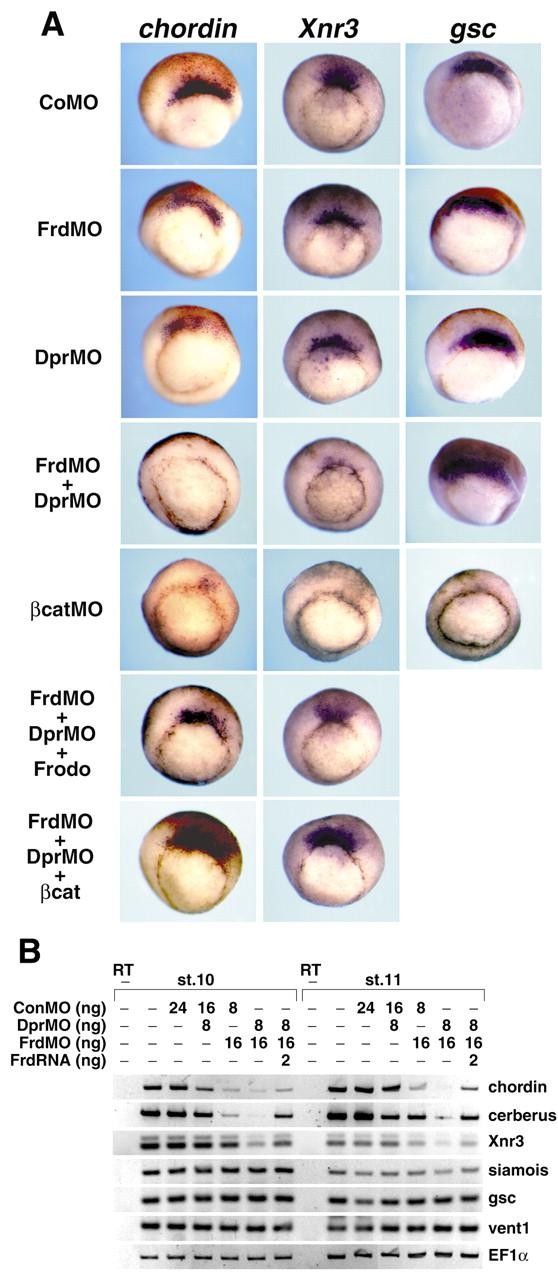 Fig. 4. The effect of FrdMO and DprMO on organizer markers. (A) Four-cell stage embryos were injected in the dorsal equatorial region of two blastomeres with morpholinos and mRNAs as indicated in Table 4, were cultured until stage 10.5 and were subjected to whole-mount in situ hybridization with organizer markers, chordin (left panels), Xnr3 (middle panels) and gsc (right panels) as probes. Co-injection of FrdMO and DprMO can reduce chordin and Xnr3 but not gsc, whereas βcatMO strongly inhibited expression of all three genes, implying that Frodo and Dapper function in a gene-specific manner. The reduction of chordin and Xnr3 by co-injection of FrdMO and DprMO was reversed not only by Frodo RNA, but alsoβ -catenin RNA. (B) Four-cell stage embryos were injected in the equatorial region of each blastomere with morpholinos and mRNAs as indicated and were analyzed at stage 10 and 11 by RT-PCR, using primers specific for chordin, cerberus, Xnr3, siamois, gsc and vent1. EF1α primers were used to control loading. Image published in: Hikasa H and Sokol SY (2004) Copyright © 2004. Image reproduced with permission of the Publisher and the copyright holder. This is an Open Access article distributed under the terms of the Creative Commons Attribution License.