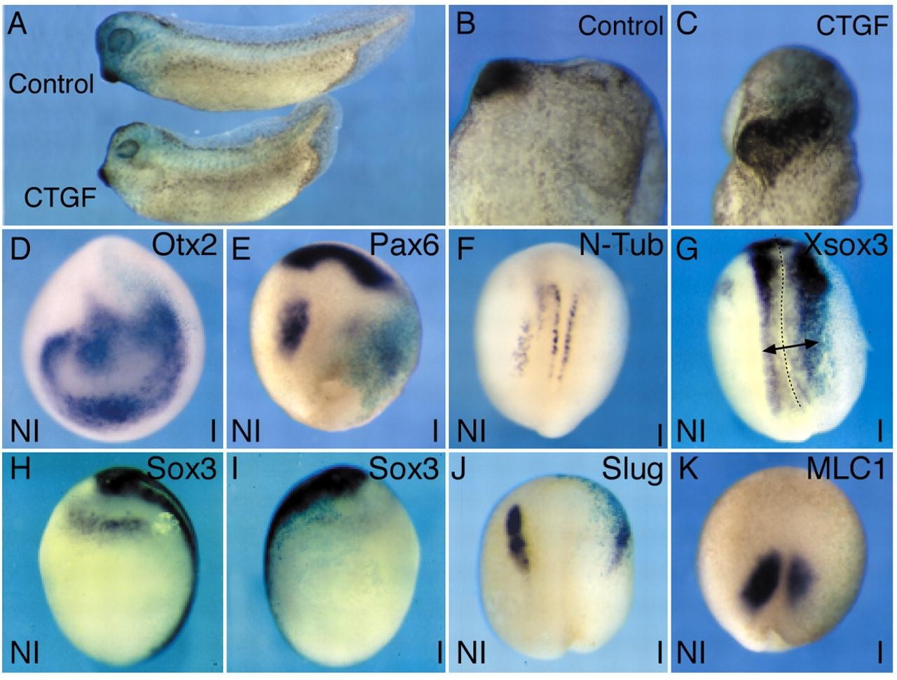 Fig. 2. The effects of overexpression of CTGF resemble those caused by inhibition of WNT signalling. (A) Overexpression of CTGF (bottom embryo) causes a shortening of Xenopus embryos. Three independent experiments were performed with similar results each time. (B,C) Compared with controls (B), CTGF-injected embryos have an enlarged cement gland (C). (D-K) Unilateral overexpression of CTGF causes changes in gene expression that resemble those caused by inhibition of WNT signalling. (D) The expression domain of Otx2 is expanded. (E) CTGF causes a down-regulation of the future hindbrain domain of Pax6 and slightly expands the anterior domain. (F) CTGF causes down-regulation of N-tubulin in the neural plate. (G) The expression domain of Xsox3 in the neural plate is expanded. (H,I) Compared with the control side of the embryo (H), CTGF causes down-regulation of XSox3 in the dorsolateral placode (I). (J) CTGF causes down-regulation of Slug. (K) The muscle-specific gene myosin light chain 1 (MLC1) is down-regulated by Ctgf. I: injected; NI: Not injected. The injected sides of embryos are identified by pale blue lacZ staining.