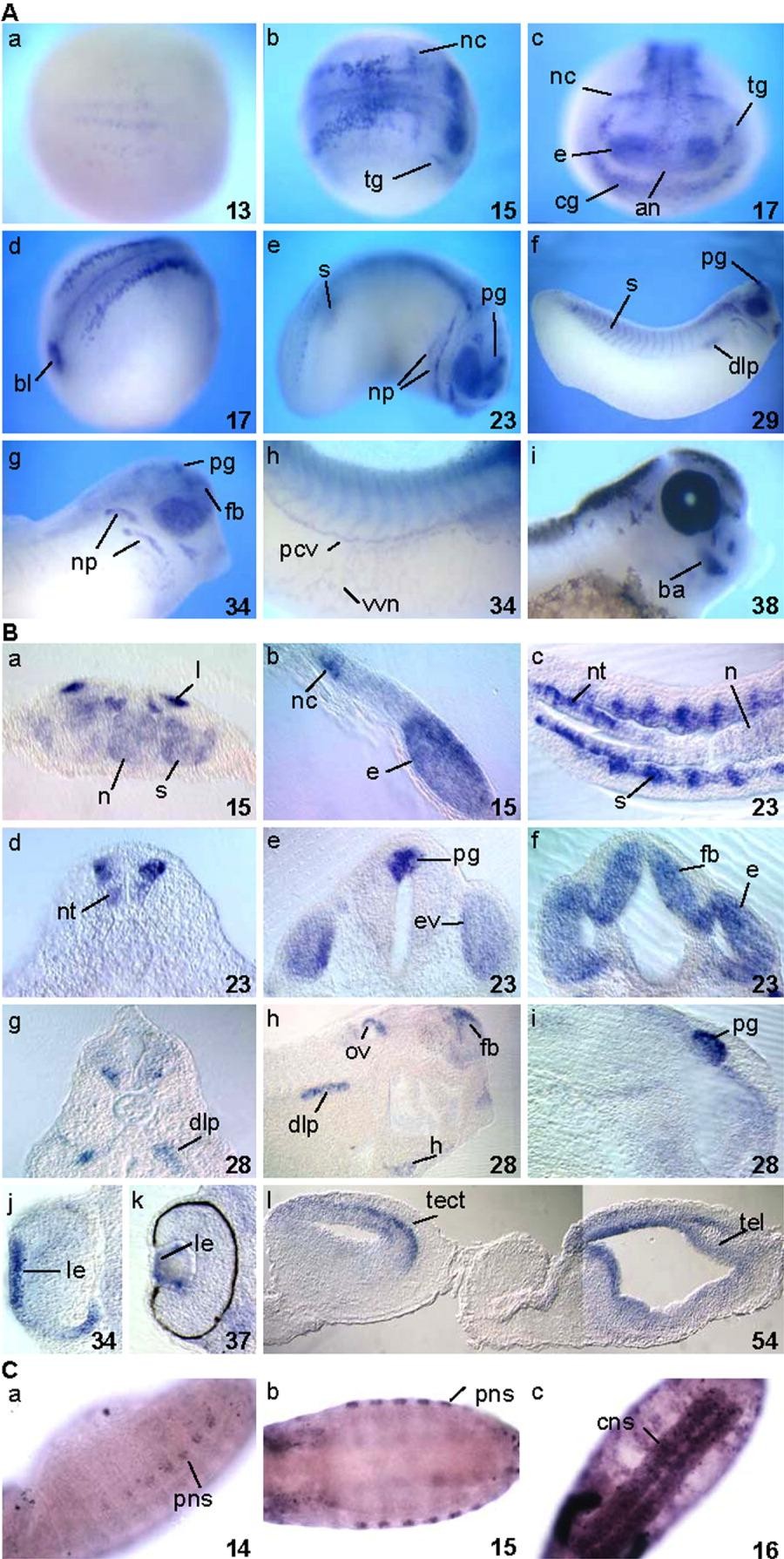 Figure 1. XBTBD6 and lute expression during embryogenesis. A: In situ analysis of XBTBD6 expression. a,b: Dorsal views. c: Anterior view. d-i: Lateral views. B: Sections of XBTBD6 stained embryos. a: Transversal section. b: Parasagittal section. c: Horizontal section. d,e: Transversal sections at the level of the eye and spinal cord. f: Horizontal section of the head. g-i: Transversal (g) and parasagittal (h,i) sections. j,k: Transversal sections of the eye. l: Parasagittal section of a tadpole brain. Nieuwkoop-Faber stages are indicated. C: In situ analysis of lute expression. a: Lateral view of a stage 14 embryo. b: Dorsal view of a stage 15 embryo. c: Ventral view of a stage 16 embryo. an, anterior neuroectoderm; ba, branchial arches bcs; bl, blastopore; cg, cement gland area; cnr, cephalic neurogenic region; cns, central nervous system; dlp, dorsal lateral plate mesoderm; e, eye; fb, forebrain; g, gut; h, heart; le, lens; n, notochord; nc, neural crest; np, neurogenic placode; nt, neural tube; ov, otic vesicle; pcv, posterior cardinal vein; pg, pineal gland; pns, peripheral nervous system; s, somites; ; tg, trigeminal ganglia; tel, telencephalon; tect, tectum; vvn, vascular vitelline network. Staging according to Nieuwkoop and Faber ([1967]). Image published in: Bury FJ et al. (2008) Copyright © 2008. Image reproduced with permission of the Publisher, John Wiley & Sons.