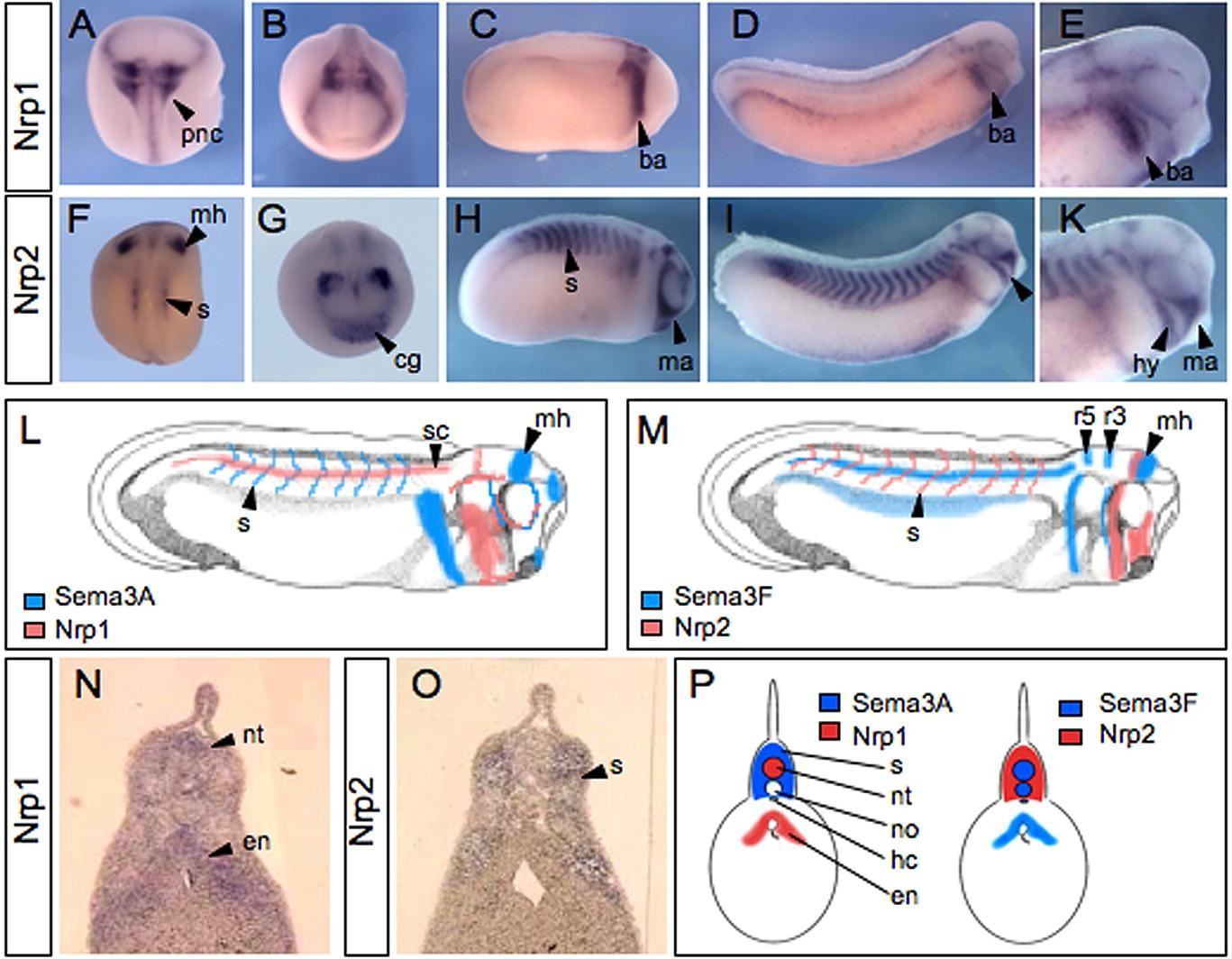 Figure 8. Neuropilin expression pattern in Xenopus laevis. A: Nrp1 expression at neurula stage, dorsal view of the embryo. B: Anterior view of A. C: Nrp1 expression in the posterior branchial arches at late neurula stage. D: Nrp1 expression at the tadpole stage. E: Higher magnification of the head shown in D. F: Nrp2 expression at the neurula stage. G: Anterior view of F. H: Nrp2 expression at late neurula stage. I: Nrp2 expression at tadpole stage. K: Higher magnification of the head shown in I. L: Schematic representation of the Sema3A/Nrp1 expression and the Sema3F/Nrp2 expression (M) of a stage-28 tadpole embryo. N: Transverse section through the trunk region of an Nrp1-expressing tadpole stage embryo. O: Transverse section showing somitic expression of Nrp2 in a tadpole stage embryo. P: Schematic picture of the Nrp1/Sema3A and Nrp2/Sema3F co-expression in a transverse section of the trunk of a tadpole-stage embryo. ba, branchial arches; cg, cement gland; en, endoderm; hc, hypochord; hy, hyoidal neural crest cells; ma, mandibular neural crest cells; mh, midbrain hindbrain boundary; nt, neural tube; no, notochord; pnc, premigratory neural crest cells; r3, rhombomere 3; r5, rhombomere 5; s, somites; sc, spinal cord. Image published in: Koestner U et al. (2008) Copyright © 2008. Image reproduced with permission of the Publisher, John Wiley & Sons.