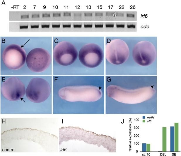 Fig. 5. Expression of irf6 in Xenopus laevis. (A) RT-PCR analysis of irf6 expression at different stages of development. Developmental stages are indicated at the top (Nieuwkoop and Faber, 1956). â RT, negative control reaction without reverse transcriptase. (BâG) Whole mount in situ hybridization for irf6. (B) Stage 10.5, left is vegetal view, arrow indicates expression in the dorsal marginal zone. Right is animal pole view. (C) Stage 11, expression is throughout marginal zone, but beginning to be lost from dorsal midline. (D) Stage 12.5, expression around blastopore, absent from prospective notochord. (E) Stage 18, expression flanking prospective tailbud region, arrow. (F) Stage 28 and (G) stage 30, notable expression in tailbud, arrowheads. (H) Section of animal cap hybridized with an irrelevant control probe (xnr3). (I) Section of animal cap hybridized with an antisense irf6 probe. Diffuse expression is found in both superficial and deep layers. (J) Quantitative RT-PCR of irf6 (green) and esr6e (blue) expression in ectodermal explants; st. 10 (stage 10 whole embryo), DEL (deep layer explant), SE (superficial layer explant). Image published in: Sabel JL et al. (2009) Copyright © 2009. Image reproduced with permission of the Publisher, Elsevier B. V.