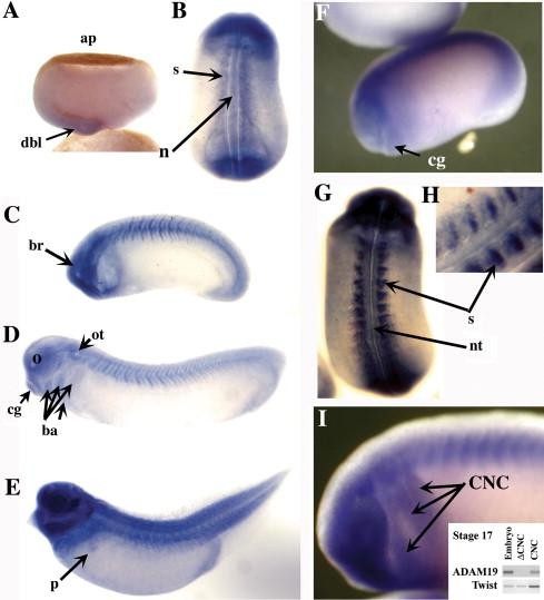 Fig. 2. ADAM19 mRNA distribution. Whole mount in situ hybridization using a probe corresponding to Xenopus ADAM19. (A) Lateral view of a bisected gastrula with the dorsal side to the left and the animal pole at the top (ap). (B and G) Dorsal views of early tailbud stage embryos with the anterior at the top. (CâE, I) Lateral views of tailbud stage embryos with anterior to the left. (F) Ventral view of an early tailbud stage embryo. Photographs in (A, F and I) were taken with embryos in PBS to visualize superficial rather than internal staining. All other embryos were imaged in Murrayâs clear. (A) ADAM19 is first expressed in the dorsal mesoderm of the gastrula, with the most intense signal in the dorsal blastopore lip (dbl). (B, FâH) At early tailbud stage, ADAM19 is found in the dorsal mesoderm including the notochord (n), somites (s), the cement gland (cg) and the neural tube (nt). (C, D and I) ADAM19 expression in these tissues persists during tailbud formation. In the anterior, ADAM19 is expressed in the brain (br), the otic (ot) and optic (o) vesicles as well as CNC segments and branchial arches (ba). (E) At stage 36, the expression in the pronephros (p) is also detected. Image published in: Neuner R et al. (2009) Copyright © 2009. Image reproduced with permission of the Publisher, Elsevier B. V.