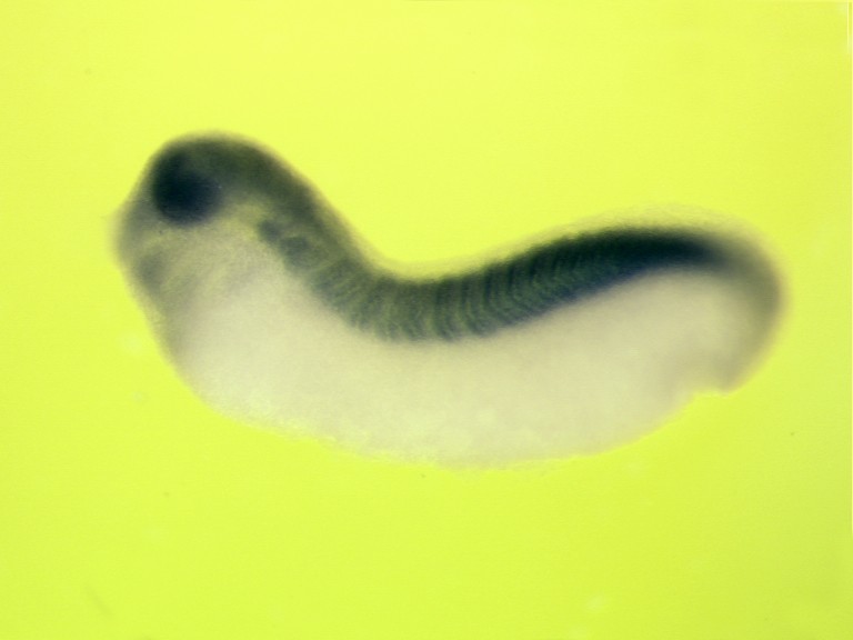 samd4b gene expression in Xenopus laevis embryo via in situ hybridization, NF stage 26, lateral view, anterior left.
