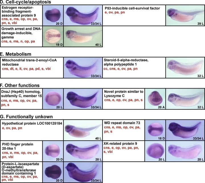 Fig. 4. The expression patterns of clones identified by the functional screen, examined by whole mount in situ hybridization using X. tropicalis embryos. Twenty-nine out of the 31 positive clones identified in the screen displayed identifiable in situ patterns of expression. The clones were divided into each of seven functional groups on the basis of their predicted/established function (A, transcription; B, cell signaling; C, post-transcription/translation; D, cell-cycle/apoptosis; E, metabolism; F, other functions; G, functionally unknown). The images are ordered by gene names (black). The main expression domains of each clone at all stages analyzed are indicated in red, although not all of these domains are represented in the photographs presented (cc, ciliated cells; cns, central nervous system; dt, distal tubules; e, eye; it, intermediate tubules; ms, migrating somite; n, primary neuron; ns, nephrostomes; op, olfactory pit; ov, otic vesicle; pa, pharyngeal arches; pcv, posterior cardinal veins; pn, pronephros; s, somite; vbi, ventral blood island). The numbers in each photograph indicate the developmental stage of embryos shown. Other abbreviations are: A, anterior view (dorsal is up); D, dorsal view (anterior is left); L, lateral view (anterior is left, dorsal is up).