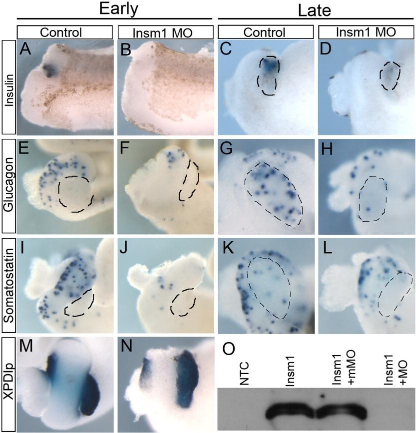 Figure 2. Insm1 is required for endocrine cell differentiation. A-D: Insulin expression at both early (NF35; 90%, n = 15) and late stages (NF40/42; 79%, n = 52) is almost completely abolished. E-H: glucagon expression. I-L: somatostatin expression. At early stages expression of both gcg and som is reduced in the stomach/duodenum of insm1 knockdown animals (100%; n = 33 and n = 12, respectively), but begins to reappear at later stages (100%; n = 8 for both). The initial expression of these markers in the pancreas is also reduced at later stages (100% for gcg and 80% for som). M,N: Expression of the exocrine pancreas marker XPDIp is normal in insm1 morpholino injected tadpoles (100%, n = 10). O: In vitro transcription and translation of insm1 either alone (insm1), in the presence of the 5-bp mismatch morpholino (insm1+mMO) or in the presence of the morpholino (insm1+MO). Pictures presented in control are of uninjected embryos, but in all cases mismatch morpholino embryos (n ge 8 for each marker) gave identical results as control, with normal expression of these markers. The pancreas is outlined. Image published in: Horb LD et al. (2009) Copyright © 2009. Image reproduced with permission of the Publisher, John Wiley & Sons.