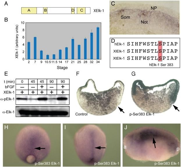Fig. 1. Spatiotemporal distribution of XElk-1 mRNA and protein. (A) Schematic representation of XElk-1 functional domains. See text for details. (B) Temporal expression of XElk-1; transcripts are maternally expressed and are present throughout early development. These data are representative of two independent experiments. Error bars show standard deviations of technical replicates of a single experiment. (C) Spatial distribution of XElk-1 mRNA in transverse sections of an albino embryo at the neurula stage reveal XElk-1 expression in notochord and somitic mesoderm. (D) Comparison of the amino acid sequences of human (h), Xenopus laevis (Xl) and Xenopus tropicalis (Xt) Elk-1 in the vicinity of human serine 383, which is phosphorylated by MAP kinase. (E) Western blot analysis of XElk-1 phosphorylation in response to FGF. Animal caps derived from embryos that had been injected with 400 pg myc-tagged XElk-1 mRNA were treated with 200 ng/ml bFGF for the indicated times and then subjected to western blotting using an antibody specific for phosphorylated XElk-1 (î±-pElk-1) or a pan-Elk-1 antibody (î±-Elk-1). Levels of phosphorylated XElk-1 are high at time zero, perhaps as a response to dissection ([Christen and Slack, 1999] and [Krain and Nordheim, 1999]) but decline by 45 min unless bFGF is present. (Fâ J) Immunocytochemical analysis of phosphorylated XElk-1 protein. (F, G) Sagittal sections of Xenopus embryos at the early gastrula stage. Control embryos incubated in the absence of primary antibody show only non-nuclear staining in cells of the yolky vegetal hemisphere. Use of an antibody directed against phosphorylated XElk-1 protein reveals staining in nuclei of the animal hemisphere and of the ventral and dorsal mesoderm, especially in the vicinity of the dorsal blastopore lip (arrow, G). (Hâ J) Whole mount immunocytochemistry showing the distribution of phosphorylated XElk-1 at gastrula (H), neurula (I) and tailbud (J) stages. pXElk-1 is enriched in the dorsal midline and extends towards the presumptive forebrain as gastrulation proceeds (arrows, H, I). At the early tailbud stage high levels of pXElk-1 are present in the presomitic mesoderm (arrow, J). Image published in: Nentwich O et al. (2009) Copyright © 2009. Image reproduced with permission of the Publisher, Elsevier B. V.