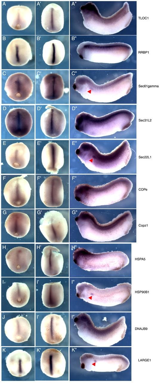Fig. 2. In situ hybridization of selected secretory pathway genes to Xenopus embryos. (A-K′) Embryos at stage 12.5 (A-K), stages 15-17 (A′-K′) and stages 28-32 (A′-K′). All of these genes show preferential expression in the notochord, and some also show expression in the pronephros (red triangle).