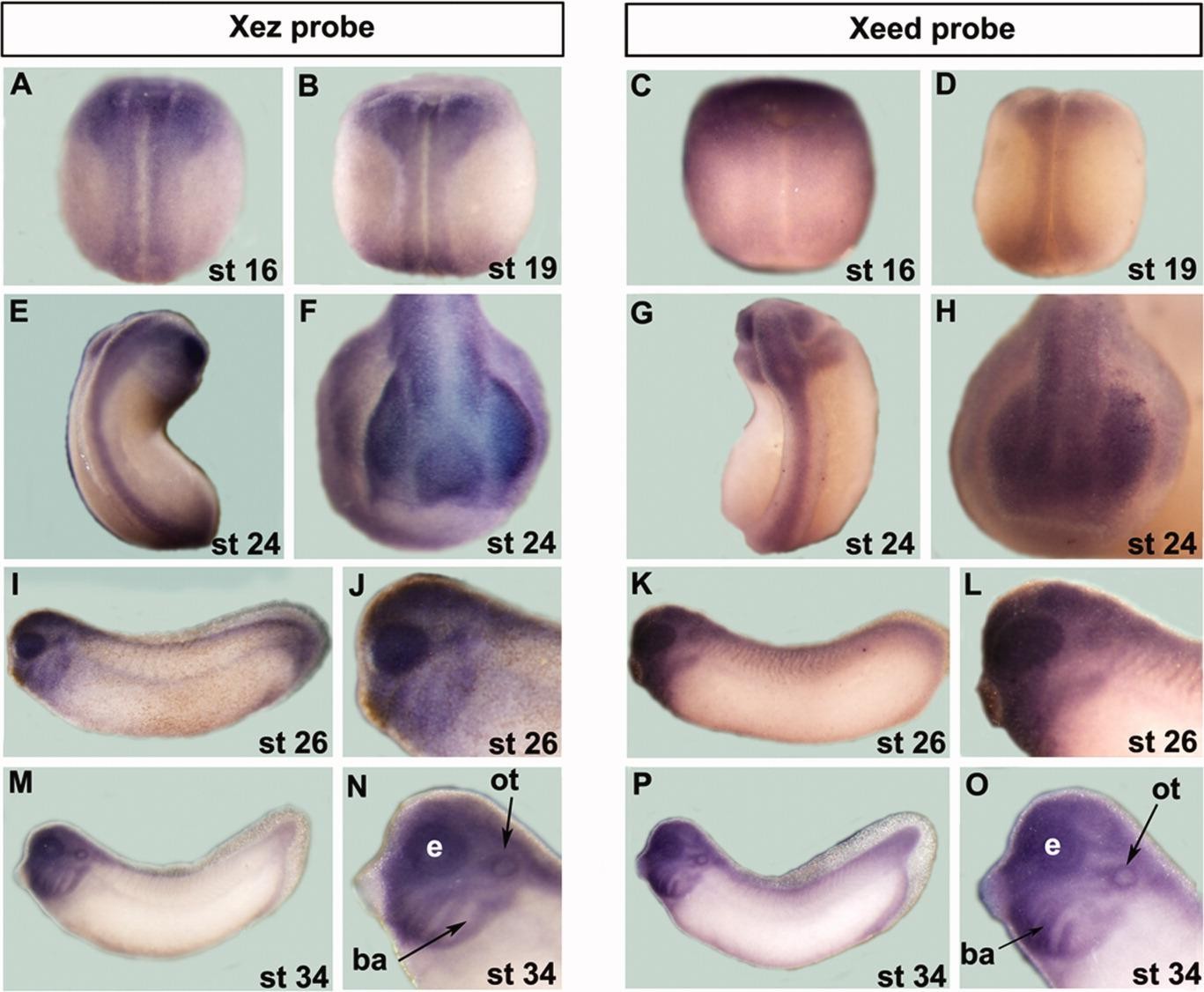 Figure 4. Comparison of Xez and Xeed spatial expression during frog development as assessed by whole-mount in situ hybridization. A B, C, D, E, G: Dorsal views. F, H: Anterior views. I, K, M, P: Lateral views. J, L, N, O: Magnifications of the head region in I, K, M, and P, respectively. ot, otic vesicle; ba, branchial arches; e, eye.