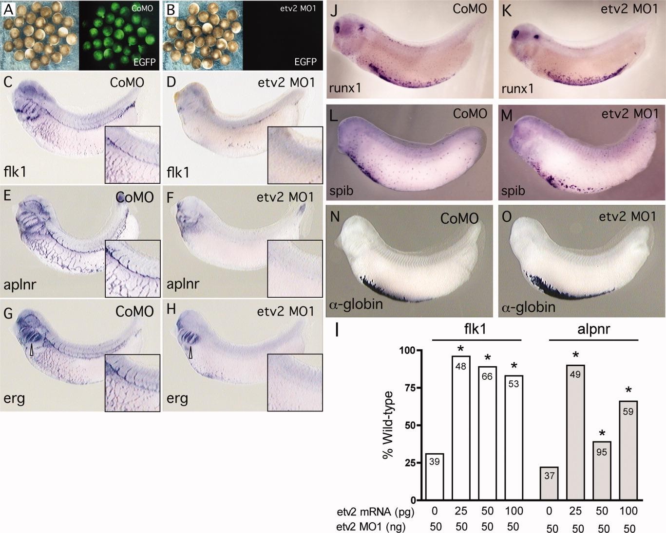Figure 5. Inhibition of ETV2 function strongly reduces endothelial, but not hematopoietic marker expression. A,B: Antisense etv2 morpholino oligomer 1 (MO1) efficiently inhibits enhanced green fluorescent protein (EGFP) expression from a target transcript in control experiments. A: Brightfield and fluorescent image of embryos injected with etv2-EGFP fusion transcript and etv2 mismatch control MO (CoMO), showing strong EGFP fluorescence. B: Brightfield and fluorescent image of embryos injected with etv2-EGFP fusion transcript and etv2 MO1. EGFP fluorescence is almost eliminated. C-M: Embryos injected with control MO (CoMo) or etv2 MO1 and assayed for marker gene expression (as indicated) by in situ hybridization. All embryos were assayed at approximately stage 32. Inset boxes in panels C-H, show slightly enlarged and/or increased contrast views centered on the intersegmental vessels and posterior cardinal vein. C-H: Treatment with etv2 MO1 effectively eliminated expression of the endothelial marker genes flk1, aplnr, and erg. In H, expression of erg in neural crest cells in the branchial arch region (open arrowhead) is unchanged. I: etv2 MO1 knockdown of endothelial marker expression is efficiently rescued with etv2 mRNA. All embryos were injected with 50 ng of MO1 plus varying amounts of etv2 mRNA as indicated. Marker gene expression was assayed by in situ hybridization and embryos showing mostly normal endothelial pattern were scored as wild-type. The number in each bar indicates the number of embryos scored for each treatment. Asterisks show statistically significant differences relative to value of MO1 alone, analyzed using Chi-squared test. J-O: Treatment with etv2 MO1 had no detectable effect on expression of myeloid (runx1 and spib) or erythroid (tadpole alpha -globin) markers.