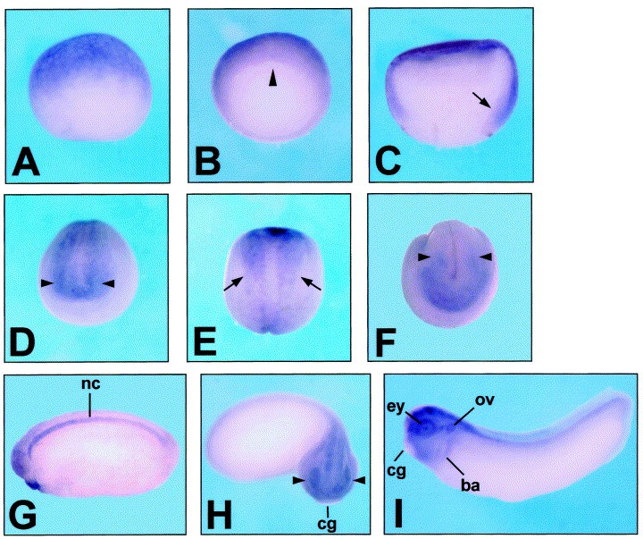 Fig. 3. In situ hybridization of XrGAP. (A) Laternal view of a blastula (stage 8) embryo showing enhanced signal in the animal hemisphere. (B) Vegetal view of a stage 10 embryo. (C) Lateral view of a sagitally sectioned stage 10.5 embryo. XrGAP transcripts are detected in the prospective neuroectoderm and the mesoderm with more enrichment at the dorsal marginal zone. An arrowhead indicates dorsal lip of blastopore. XrGAP expression is also detected in the dorsal involuting cells (arrow). Anterior view (D) and dorsal view (E) of mid-neurula (stage 16) embryo. XrGAP is expressed at the neural folds from anterior to caudal end, but absent from the dorsal midline. Note the expression in eye anlange (two arrowheads) and neural folds (two arrows). (F) Anterior view of late neurula (stage 20) embryo. XrGAP expression remains restricted to eye anlagen (two arrowheads) and antero-ventral portions of neural regions as a crescent-shape. (G) Lateral view of a sagittally sectioned stage 23 embryo. Expression is observed in notochord but absent from other mesodermal tissues. (H) Anterior view of a stage 25 embryo. XrGAP expression remains restricted in the developing brain and eye vesicle (two arrowheads). (I) Lateral view of a tailbud (stage 30) embryo. XrGAP expression persists in the developing brain, spinal cord, eye, branchial arches, and otic vesicle. ba; branchial arches, cg, cement gland; nc, notochord; ey, eye; ov, otic vesicle. Image published in: Kim J et al. (2003) Copyright © 2003. Image reproduced with permission of the Publisher, Elsevier B. V.